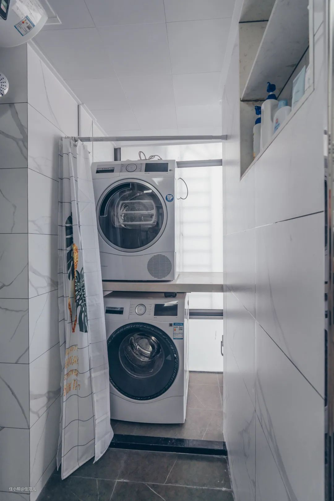 原来窗户外有剩余1㎡的空间没利用上,设计师就将墙打掉部分,加固做了个小平台,刚好用来放置洗衣机和烘干机以及一些清洁工具。