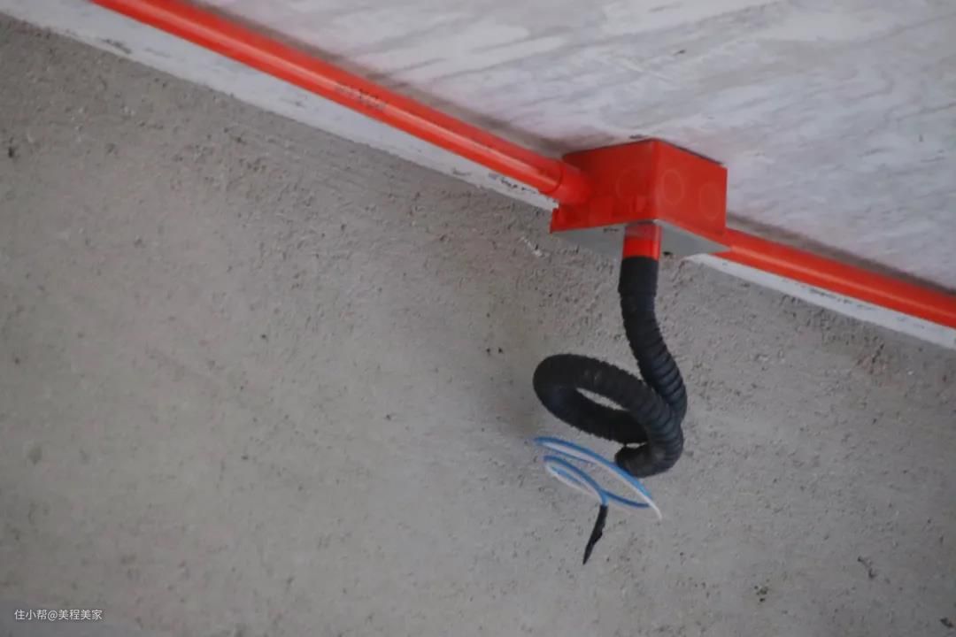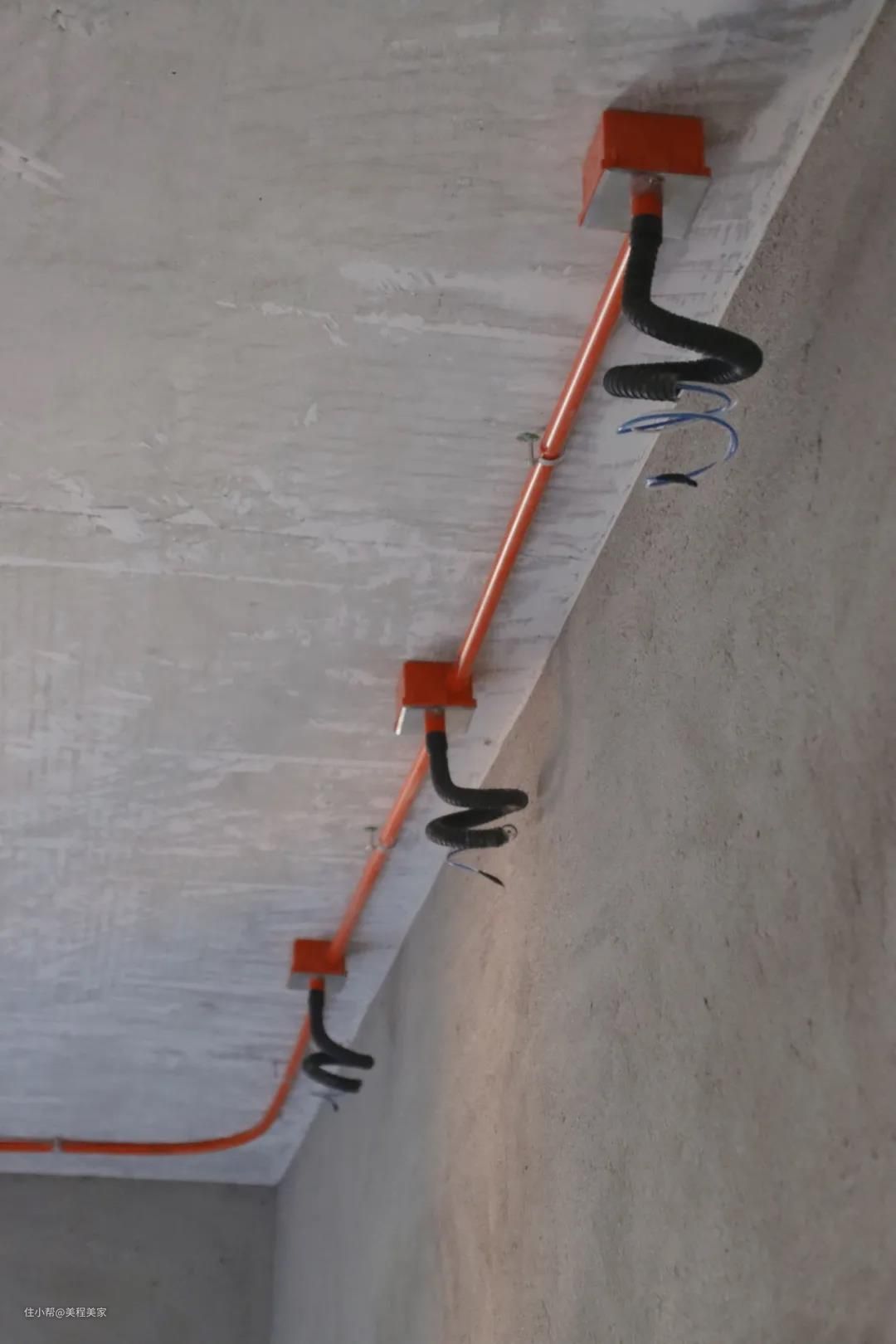 检查线头处理:所有顶部灯具安装线盒外 预留50厘米 并且电线套上软管卷成弹簧状,确保后期灯具安装有足够的电线长度。