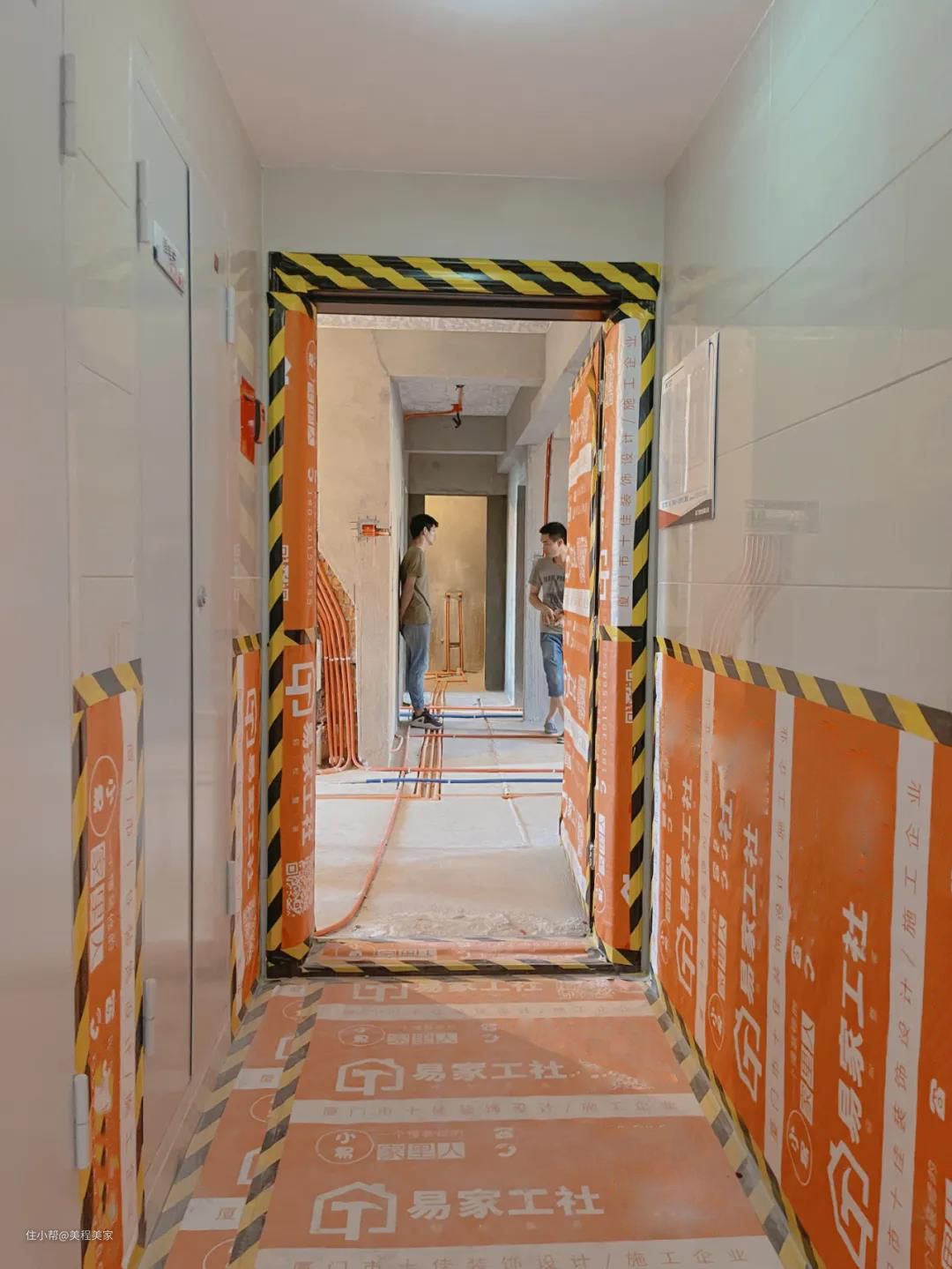 过道墙面使用编织保护膜,避免瓷砖有划痕及碎裂。地面采用较厚的软质保护层地垫进行保护。门框及门把全面包裹保护每一面,以免造成不必要的损失。