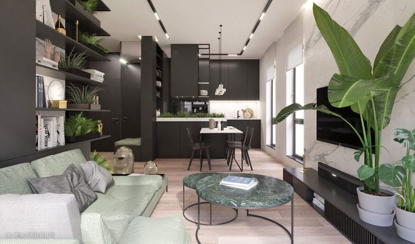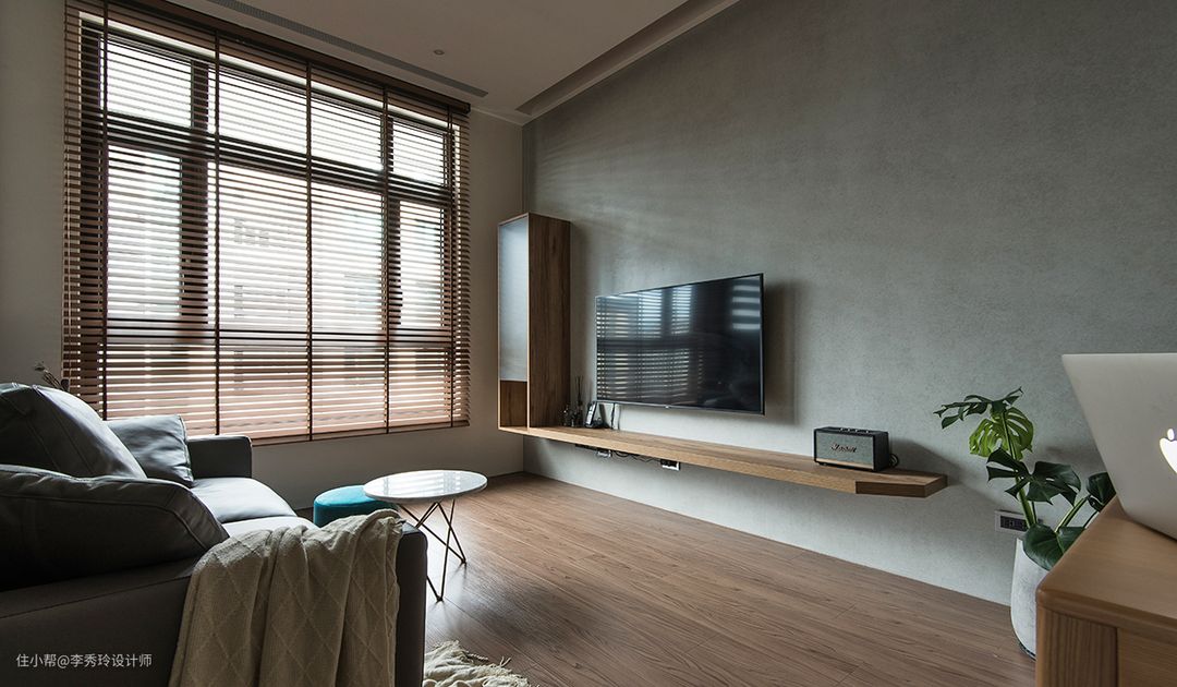 在一些横厅的设计规划中,电视也常常作为空间隔断居中设计,为了保证空间通透感,多会将电视与半墙隔断结合,如下: