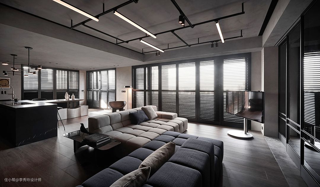 根据户型结构和实际的生活需求,也可以不要电视背景墙,直接将电视固定在一根粗壮的黑色金属管上: