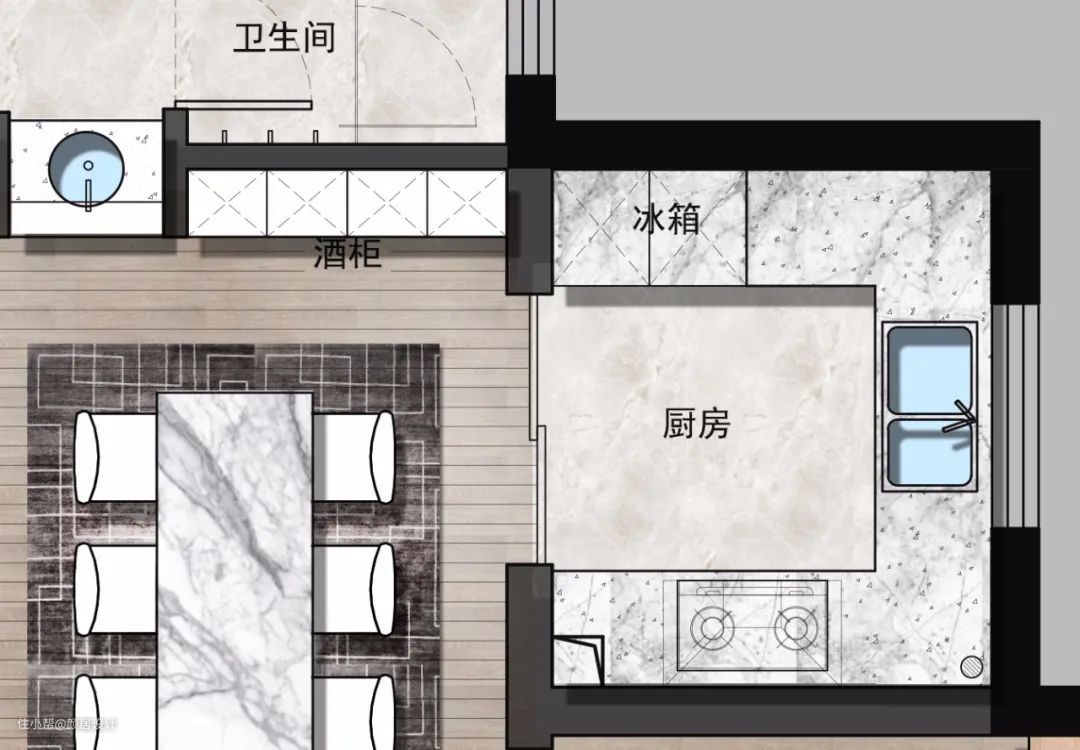适用于厨房空间面积大的大户型空间,且经常在餐厨一体或开放式厨房中使用。