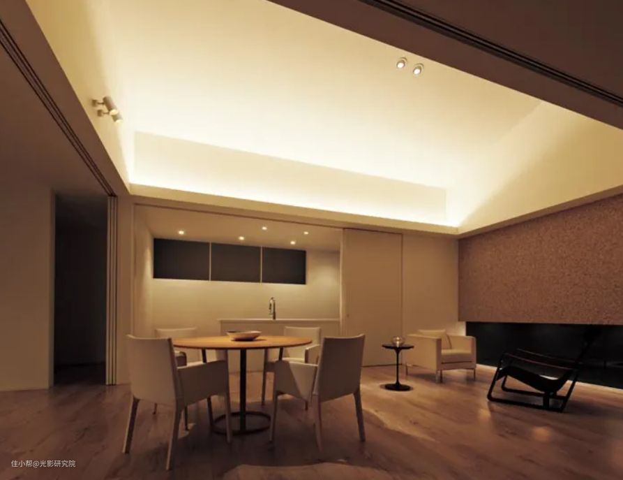 在天花板上搭建一个灯槽,将灯带或是层板灯安装在灯槽里,光线通过灯槽打亮天花板再扩散出来,形成一种柔和的间接光照亮空间,这就是大名鼎鼎的暗灯槽设计。