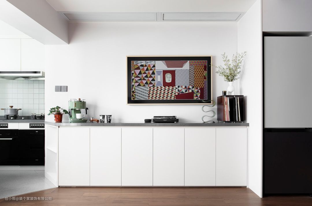 我们在意材料的精致与实用 从板材的选择与款式 再到柜台上摆放的物件 电视机、咖啡机、杯子、书架、绿植 无一不讲究