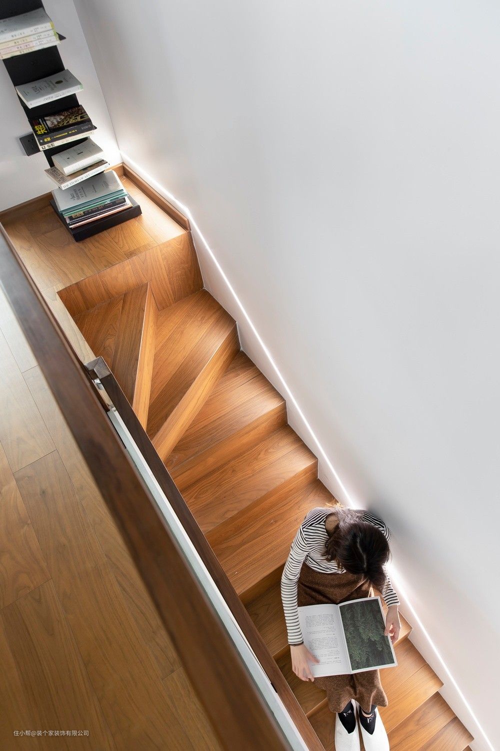 楼梯的木色亦是胡桃木色 转角处摆放一个书架 闲暇时候坐在楼梯处看书 也是闲情雅致的事情