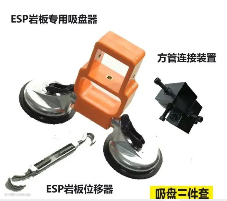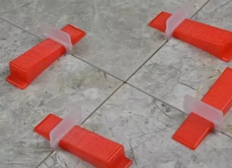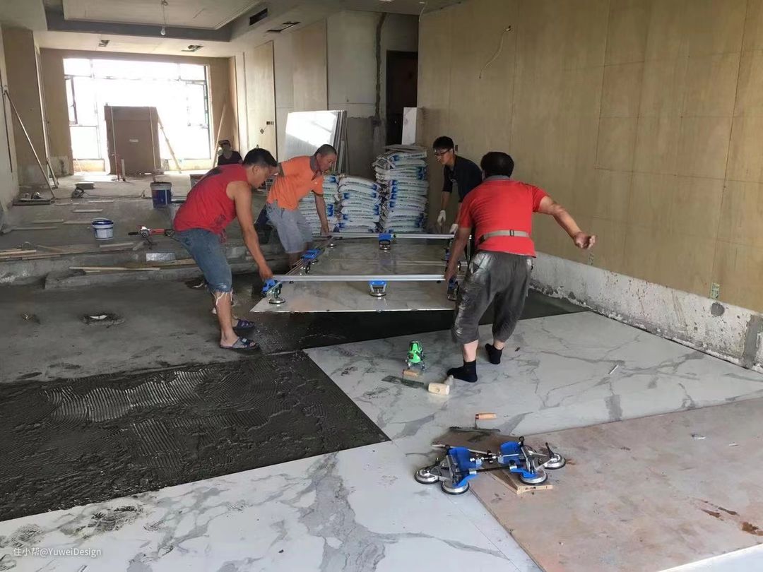 5、搬运铺贴,用三孔玻璃吸工具平抬大板平移施工位置,放置到铺好的瓷砖胶基面上,至少需要两名工人进行搬运,面积更大的使用移动架搬运。根据设计的要求,在大岩板粘贴时应使用适当规格的定位器,以保证留缝的尺寸满足设计要求,并保证留缝宽度的一致。