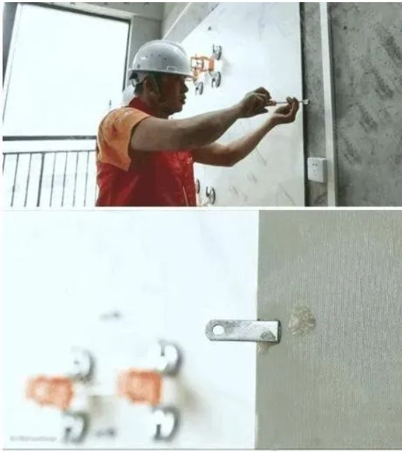 2、胶粘法 不锈钢角片固定,与地面安装方法相同,可加粘不锈钢角片,使安装更加安全,两块角片间距不得超过 600mm。待AB胶固化后方可上墙,根据在岩板上不锈钢角片的孔位;