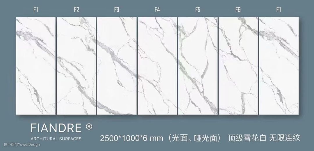 1000mmX1500mm,1500mmX3000mm,1000mm×3000mm尺寸,厚度为6/12mm是fiandre翡安爵岩板的规格。大规格岩板无论是铺贴应用还是切割组合应用,都能满足市场不同消费群体需求。