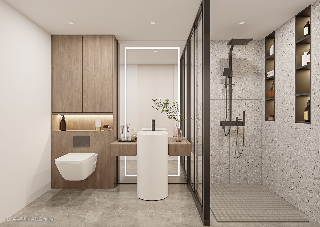 干湿分离的卫生间设计,一整面的落地镜,空间视觉扩大。