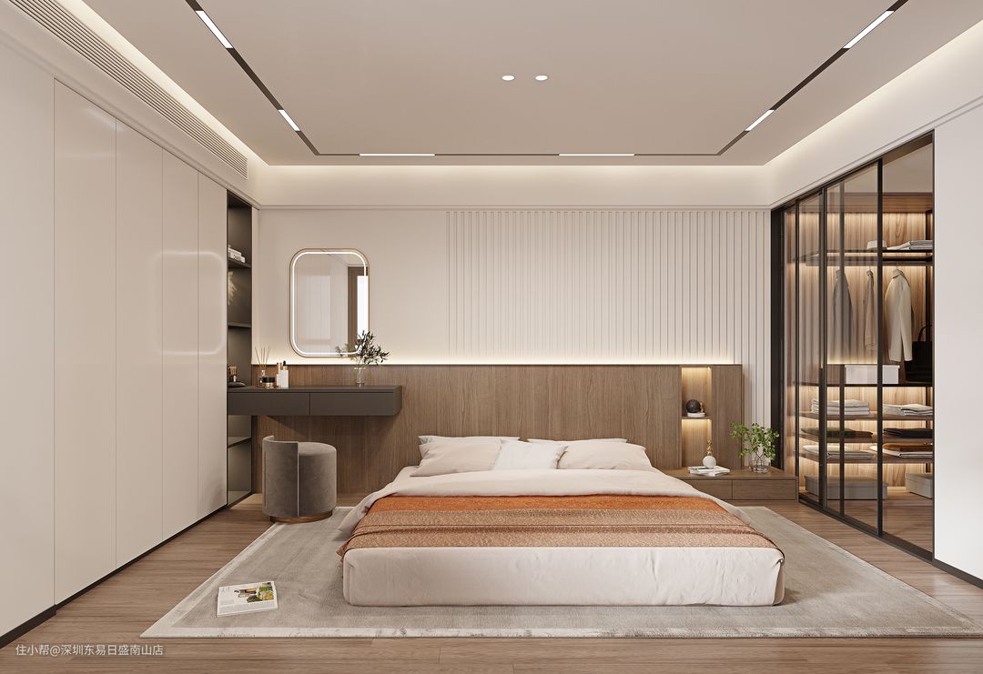 业主不要床的设计,定制的床头木饰柜,高低错落有致,上为白条拼接,一面镜子镶在其中,玻璃推门下的衣帽间,灯带增加光亮。居室无主灯设计,黑色灯带围绕整个空间。