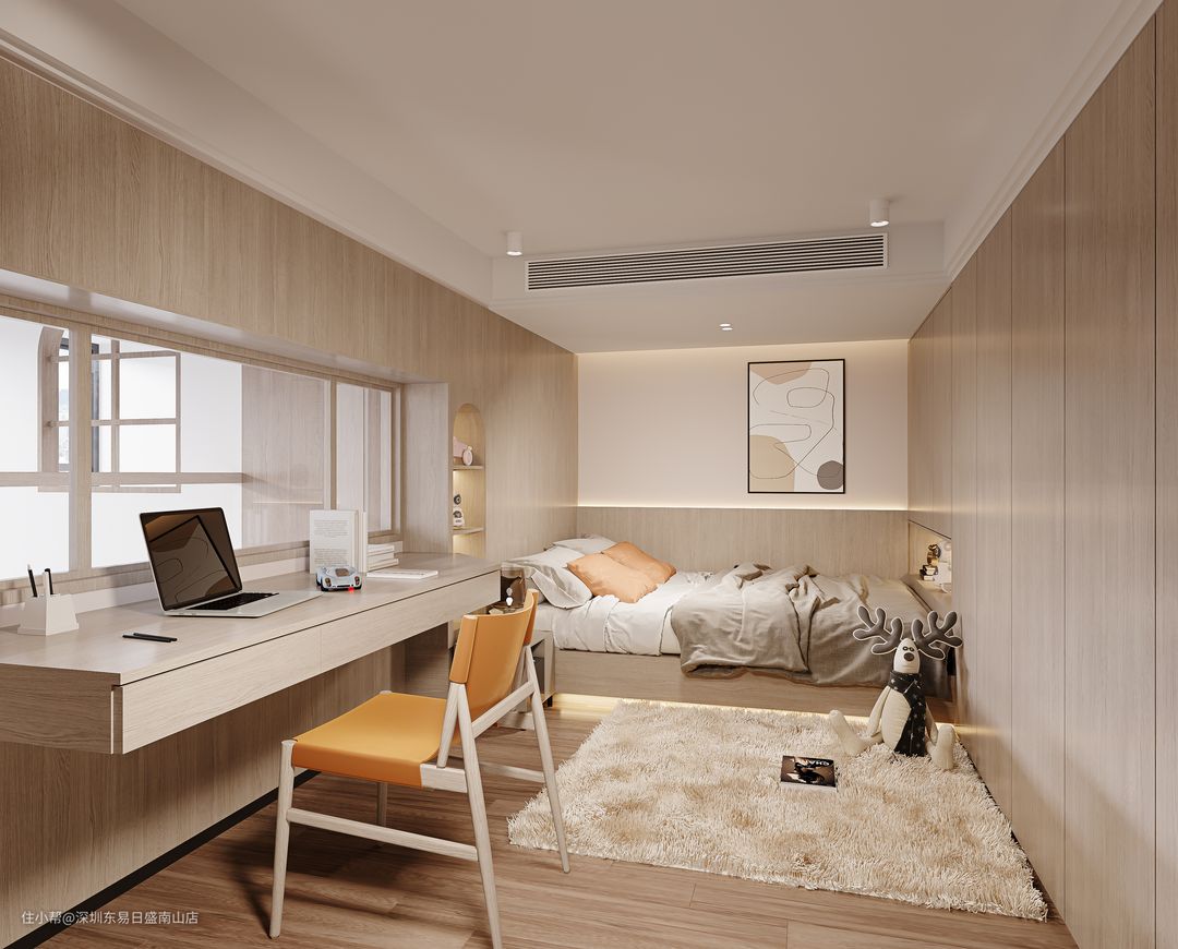 木饰面为主的次卧,靠窗处做悬空书桌,,橙色做跳色,温馨恬静。
