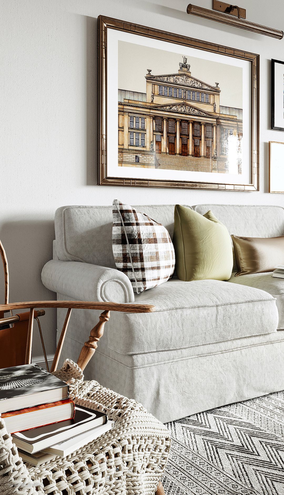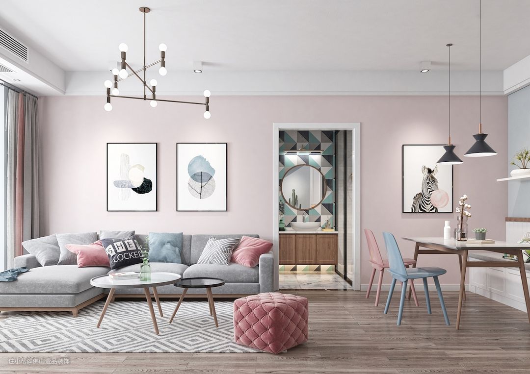 这里有一个注意点,是有关于挂画的尺寸大小还有安装,尺寸方面就是看具体的位置了,而在安装比例方面,首先挂画安装的高度一般是离地1.5米,而大小尺寸的话:一般多幅小尺寸组合的话,是控制在沙发摆放区域的沙发扶手以内;而单幅大尺寸的话,一般在沙发摆放区域的居中区域,宽度比例建议以沙发两侧与中间顶部做个三角区,挂画底部控制在三角区域内即可。