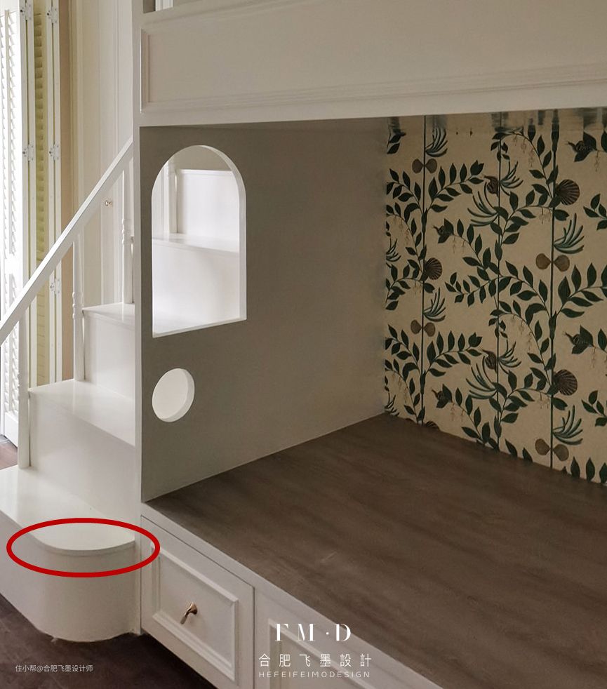 楼梯比较平缓,还有扶手设计,孩子爬上爬下父母都不用担心,楼梯踏步长70cm,进深23cm,孩子坐在上面休息看书,充当个休闲区也不错。底部设计成圆弧状,杜绝孩子日常碰撞产生的安全隐患。