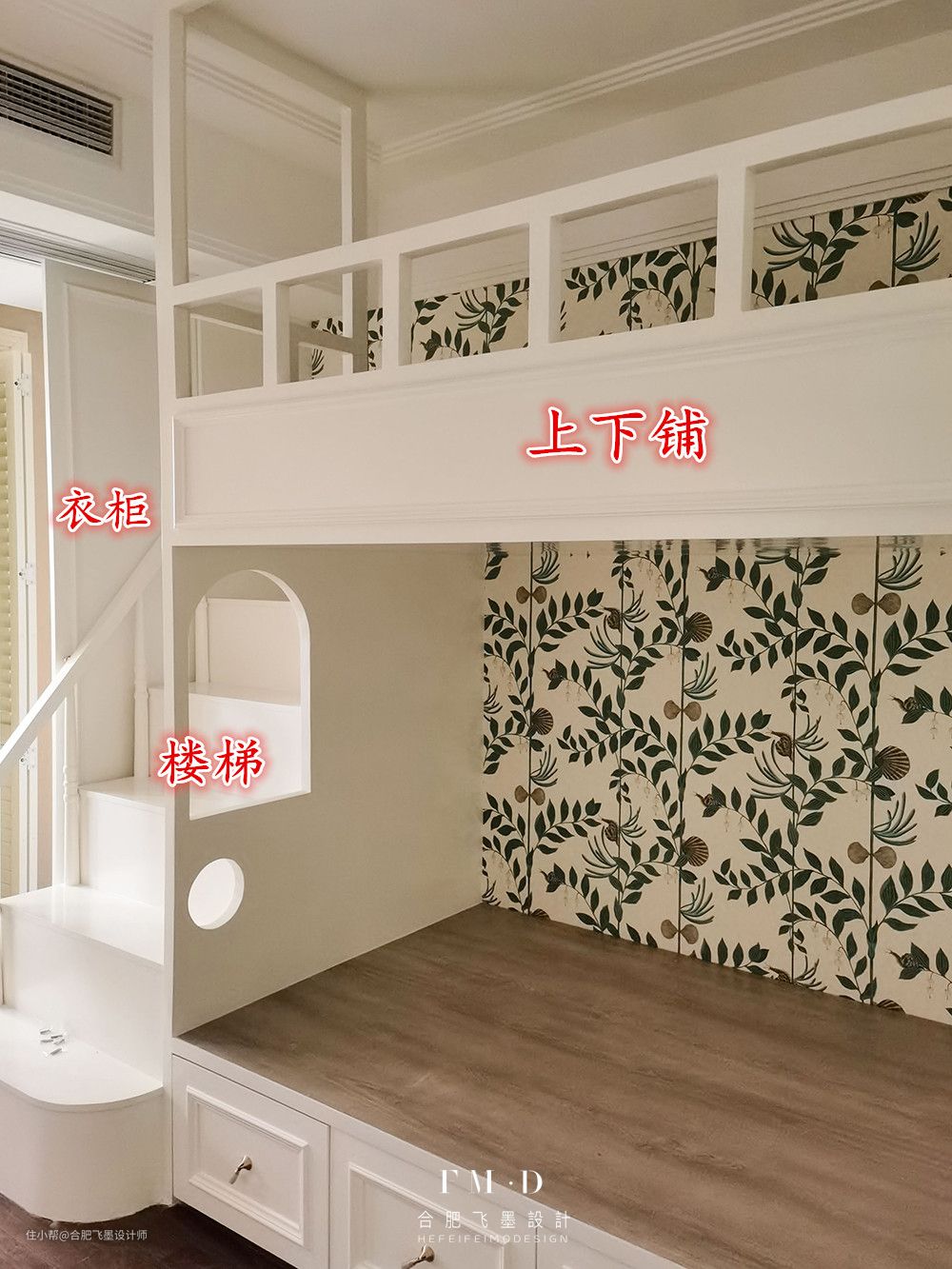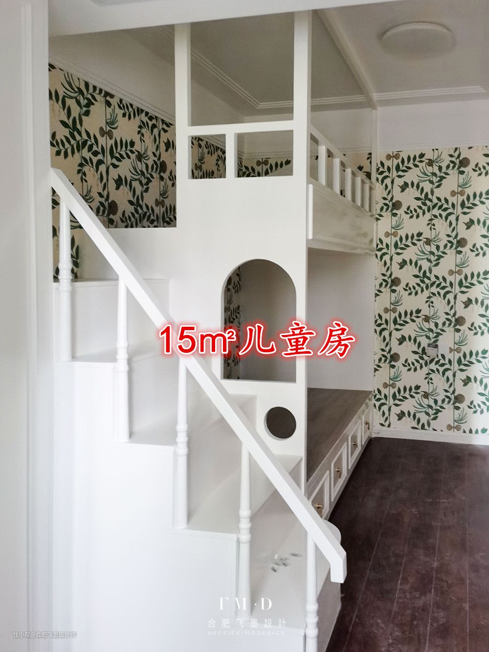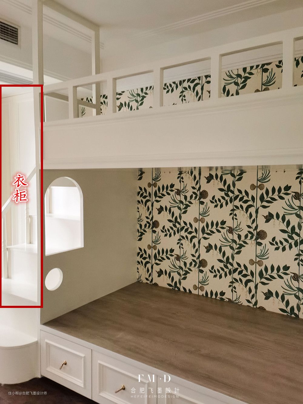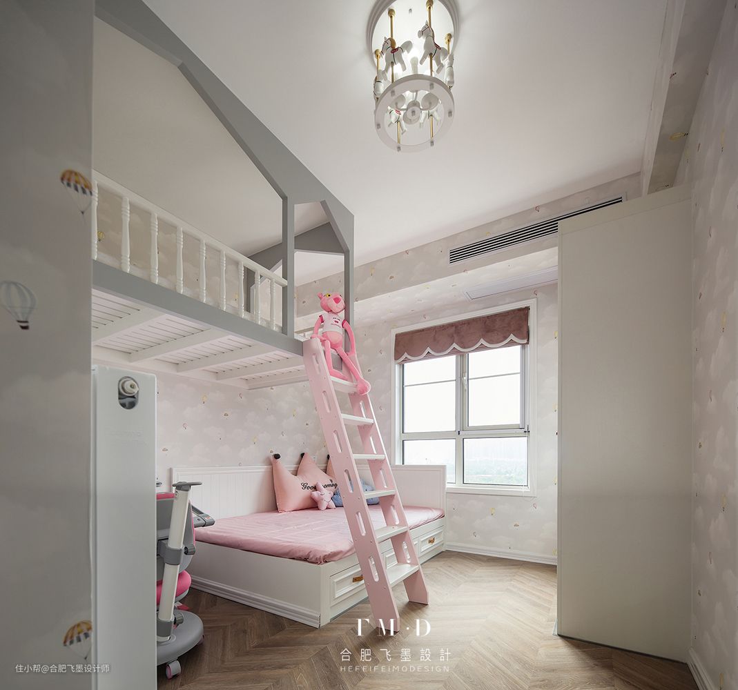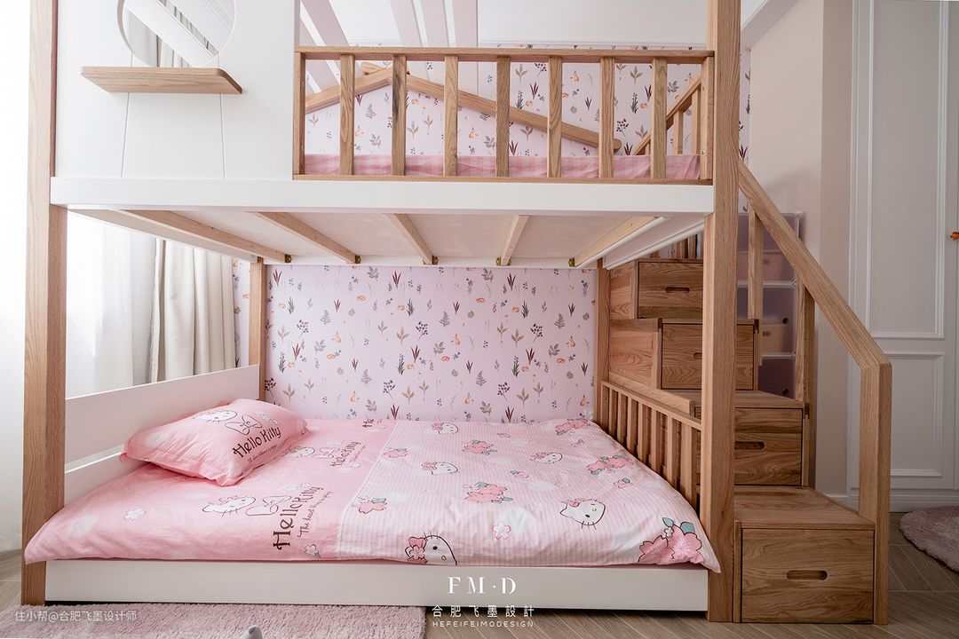 上铺空间还算宽敞,旁边增加护栏设计。儿童房墙壁铺上了花色墙纸,可就太好看啦!而且还能防止被子蹭到墙上会弄脏。