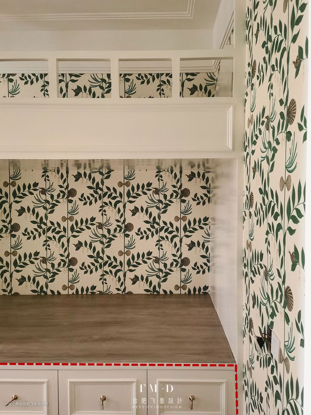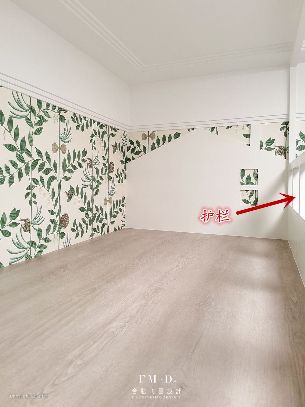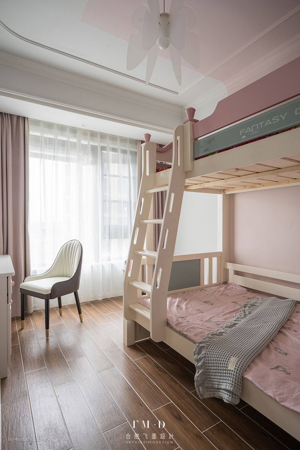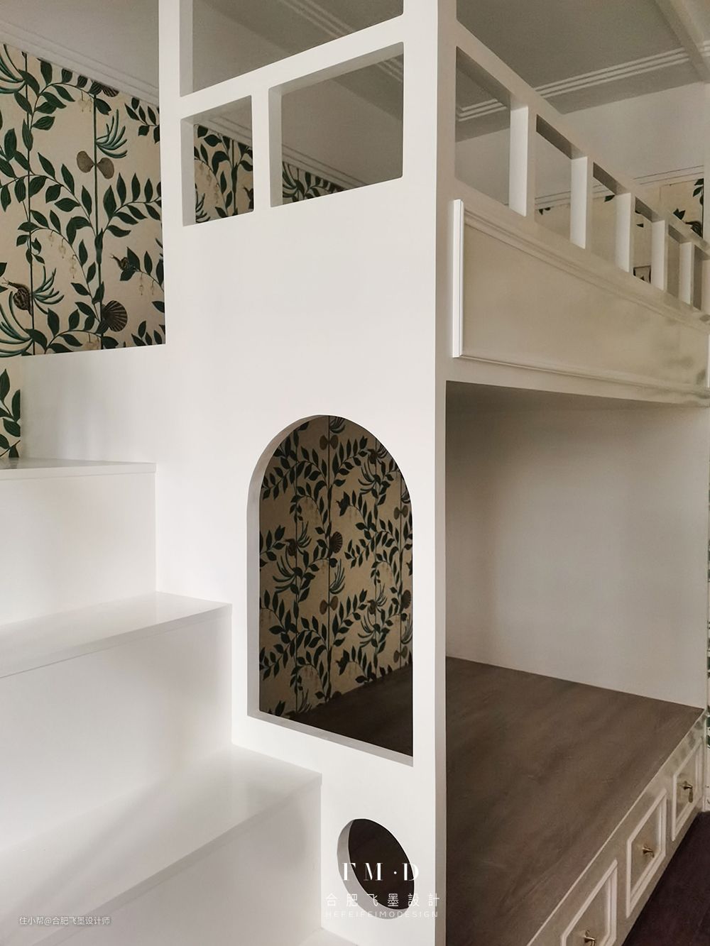上铺空间还算宽敞,旁边增加护栏设计。儿童房墙壁铺上了花色墙纸,可就太好看啦!而且还能防止被子蹭到墙上会弄脏。