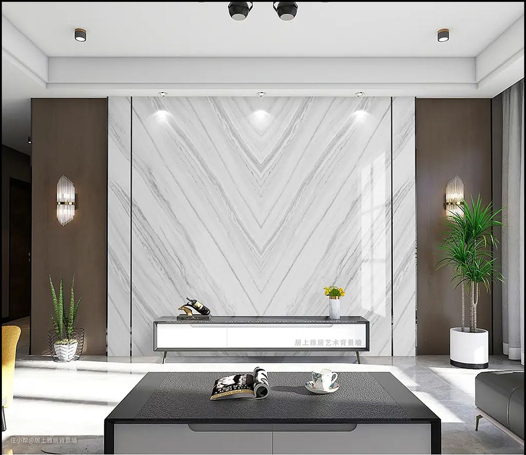3.实木柜搭配石材或岩板背景墙。