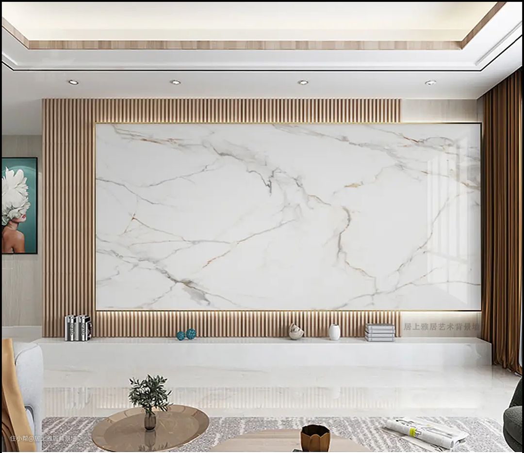 实木与石材岩板这样搭配,再也不怕电视背景墙单调没有层次感了