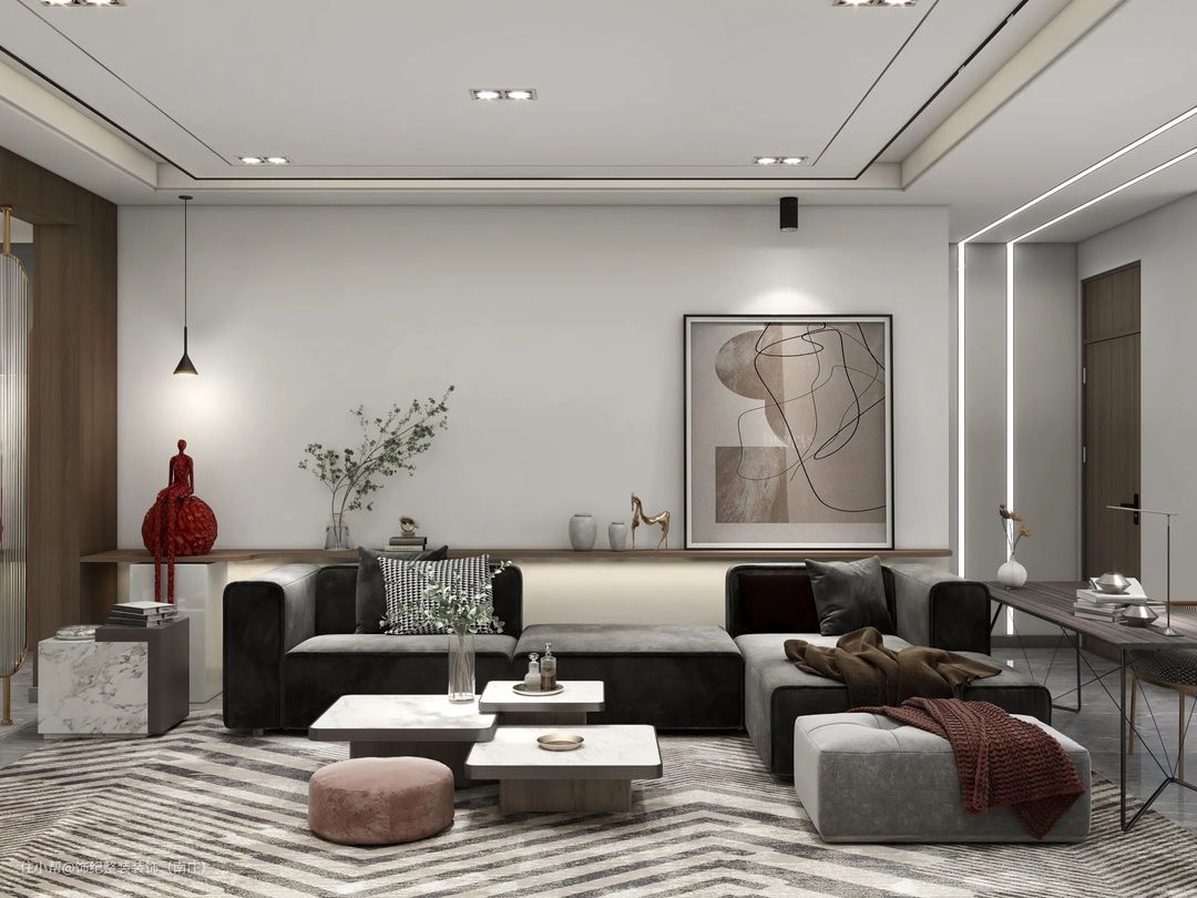 平面式吊顶无需任何的造型和层次不占用客厅层高,平面式吊顶设计简洁、整体空间视觉效果简洁大气且宽阔敞亮,平面式吊顶对户型没有限制可以直接套用、平面式吊顶大多数用于小户型和房屋高度较低的户型,如果觉得平面式吊顶整体效果比较单调可以在吊顶的边框嵌入金属线条使整个吊顶的精致且有层次感。