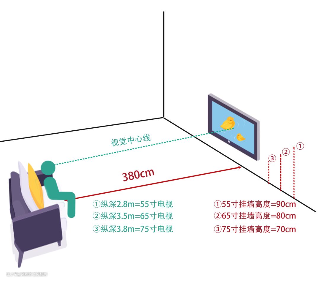 普通人坐下时高度为105-125cm,平视直达电视中心点,也就是电视中心点离地80-115cm的高度最舒适(还要考虑电视屏幕的大小)。