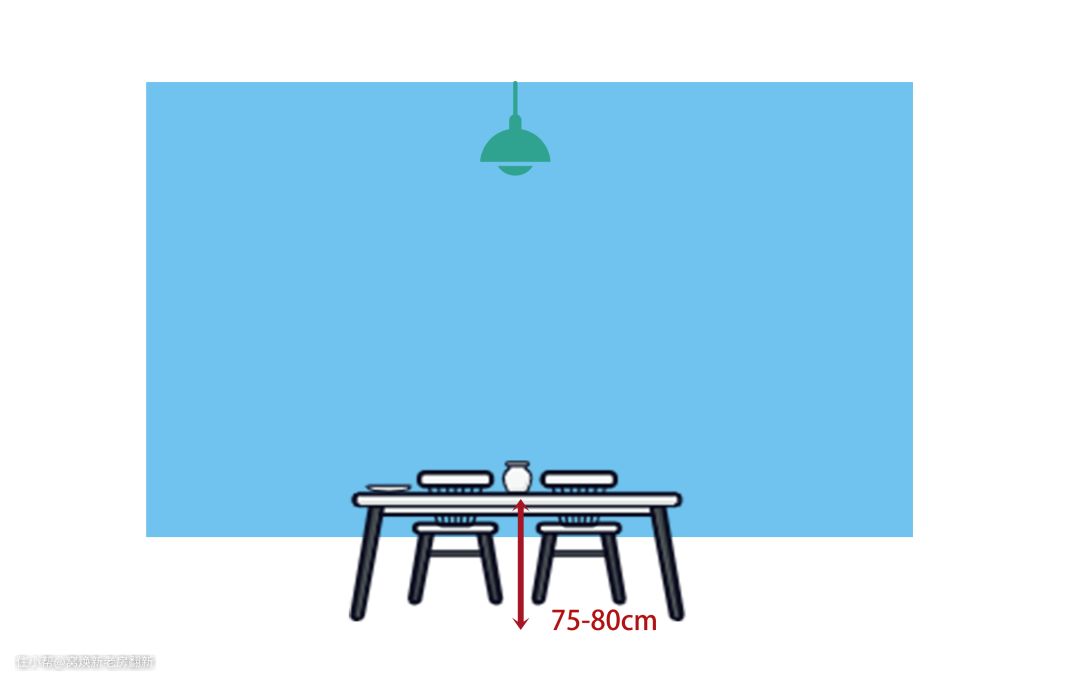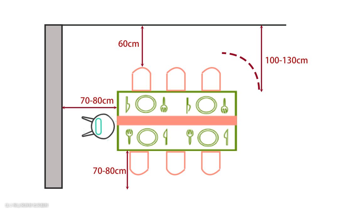 1. 餐厅空间首先要考虑的是餐桌,与墙面至少空出70-80cm的距离,保证拉开餐椅后还能有一定的活动空间。