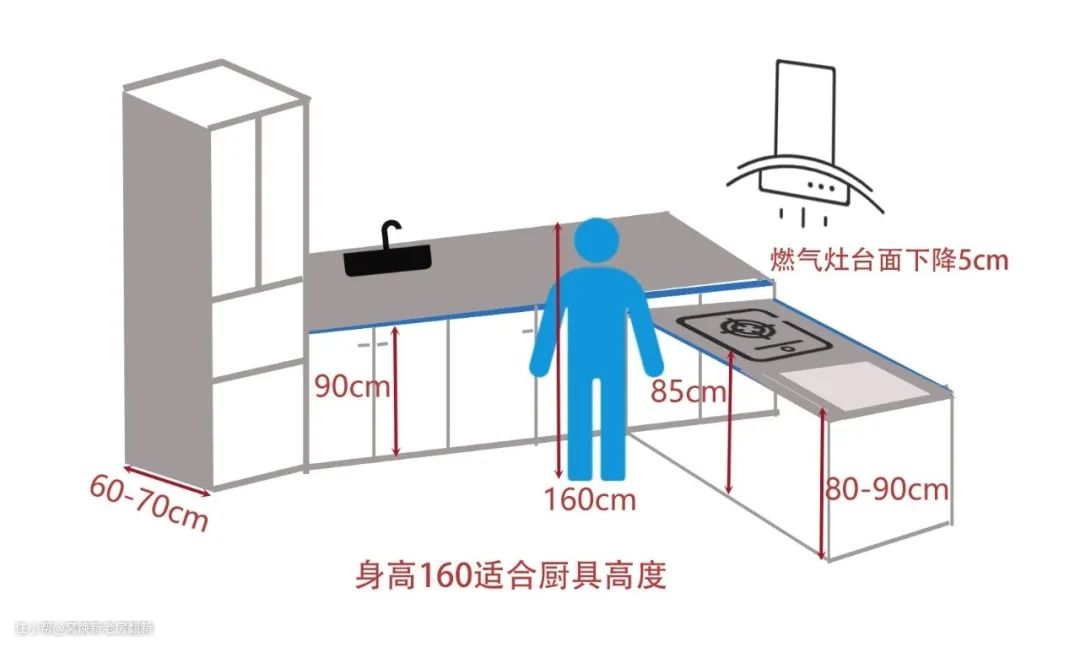 台面要按照水槽和燃气灶深度来定,常见深度为60-70cm,一字型台面的话总宽度200cm以上比较舒适;L型台面则长边不超过280cm,以免动线过长影响操作速度。