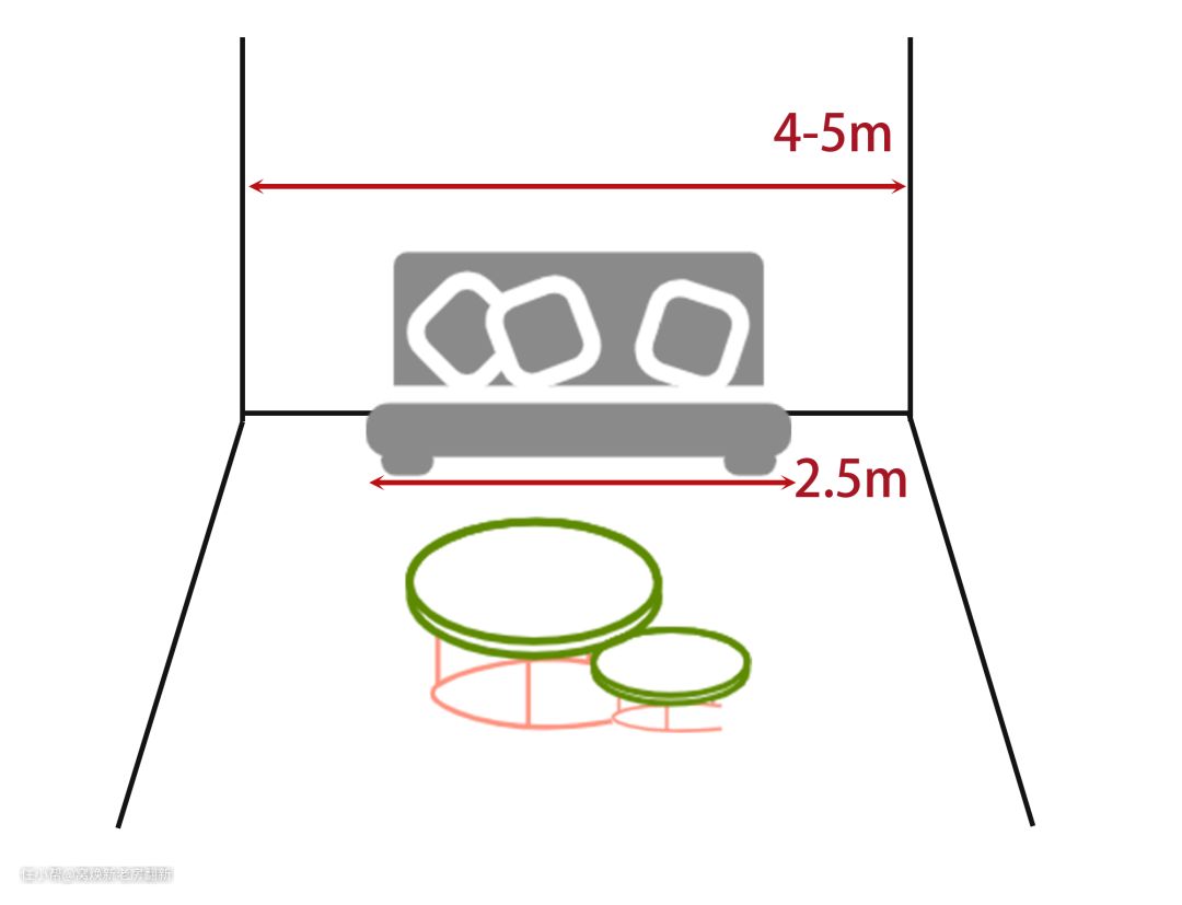 主墙长度最好不要小于3m,如主墙宽4m则沙发宽度建议为2.5m,旁边可以搭配0.5m的边几或沙发凳使用。