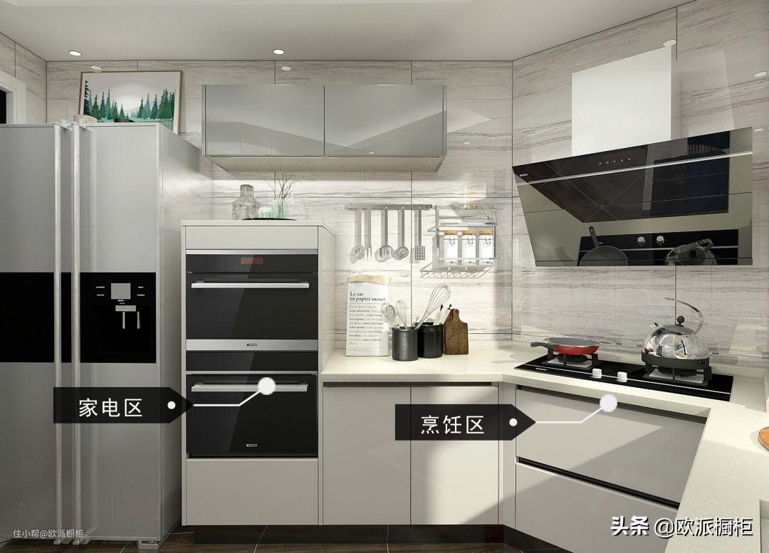 钝角的位置利用拐角做斜面处理,链接了地柜和高柜,最大化利用空间;电器柜与冰箱一字排开,形成烹饪区和家电区,让厨房显得整齐划一。