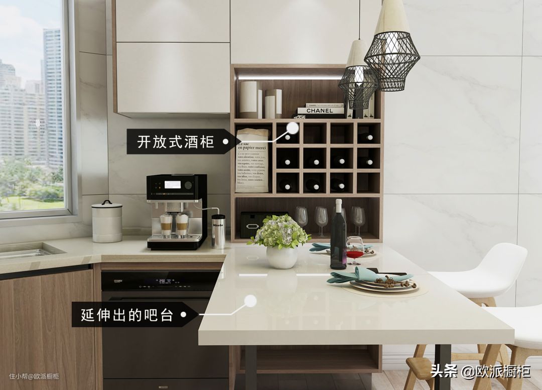 吧台连着橱柜操作台,配合着吧台凳化身为餐桌,旁边就近定制开放式酒柜,十分方便拿取,在家也能享受静谧的时光。