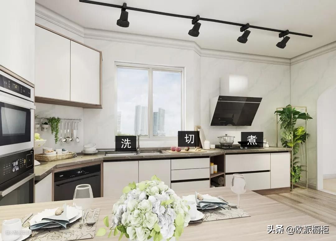 右边贴着墙面设计了洗涤区和烹饪区,将“洗、切、煮”动线纳进来考虑,形成一个流畅的过程,大大提高烹饪效率。