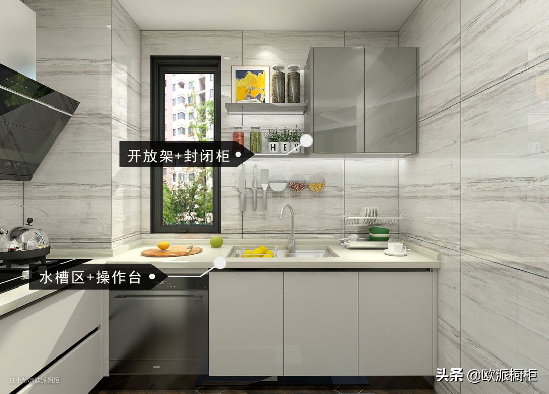 靠窗一侧的橱柜划分出水槽区和操作台,上方设计了开放架+封闭柜,让厨房有充足的收纳空间。
