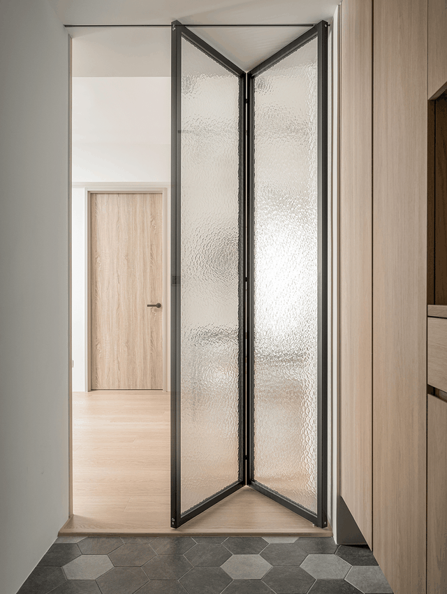 玻璃折叠门关上后,可以将屋外的杂音很好地阻隔掉;而且水纹玻璃的材质透光不透物,不会影响室内采光,光线穿过时,还能折射出有趣的雾透感。折叠门材质轻薄,打开后可直接靠墙摆放,不占空间。