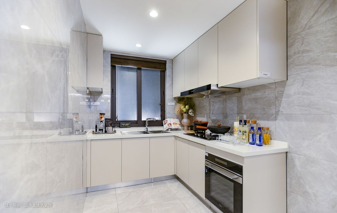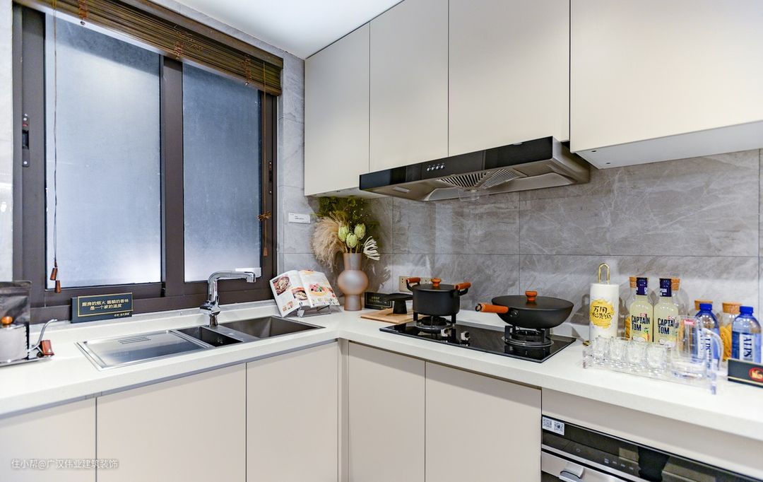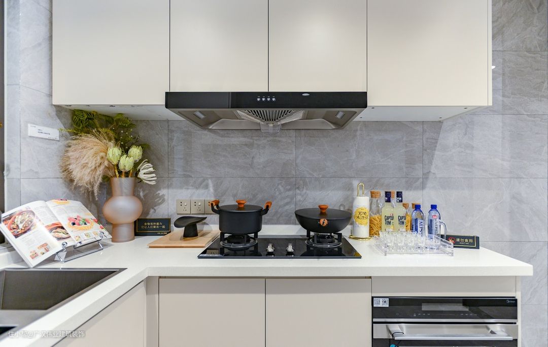 大理石饰面打造的L型厨房,搭配白色柜体,使得厨房整洁大方。可以将厨房门打开与餐厅相连作为一个开放式的料理场所。关上移门也可以轻松隔绝油烟,让主人尽情展示中式厨艺。