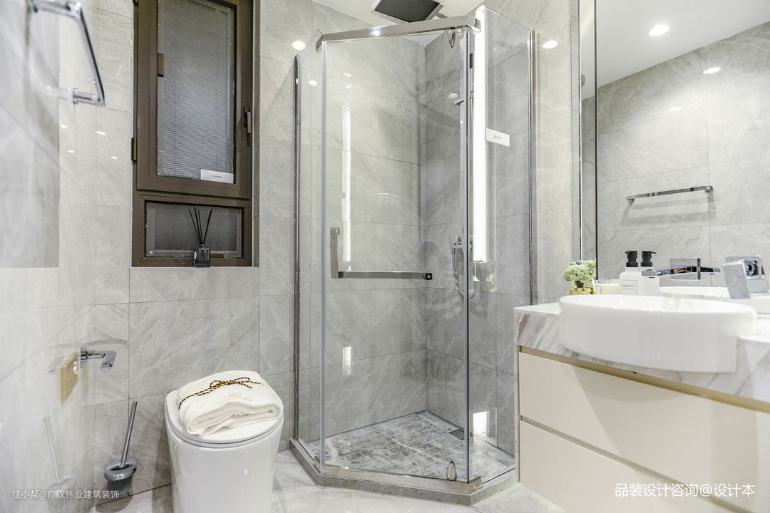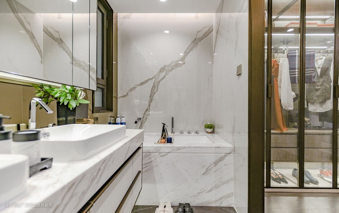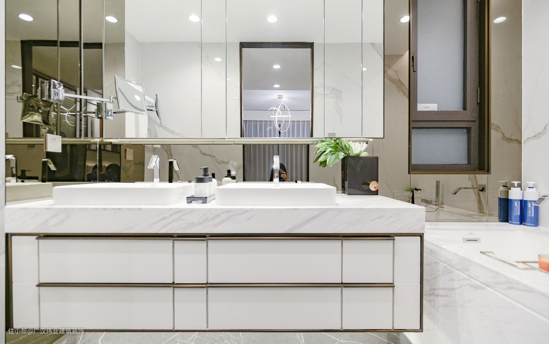 卫生间在当下流行的干湿分区基础上做成了三分区设计,分别为马桶区,卫浴区和泡澡区。各式柜体的搭配不仅显得整洁大方,更是提供了充足的收纳空间。