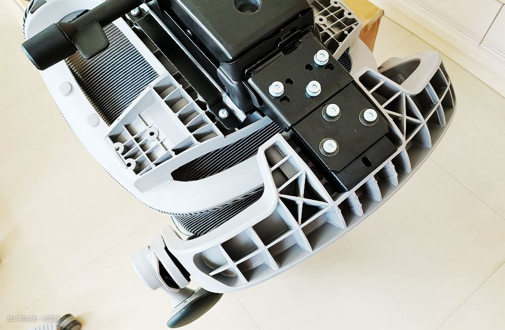 除了气压杆,座椅底部的防爆钢板底盘也是安全的重要保障,这款工学椅配备了厚厚的防爆钢板,拿起来很重,还是很有安全感的。安装的话,只需要借助外箱,将座椅和靠背用附带的3颗螺丝固定即可。
