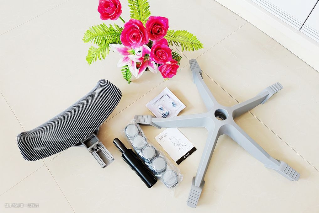 网易严选人体工学转椅全家福:坐垫、座椅靠背、钢结构五爪、头枕、2个扶手(集成)、5个滚轮、1个气压杆、说明书质保卡、以及安装工具包(螺丝、扳手等)。