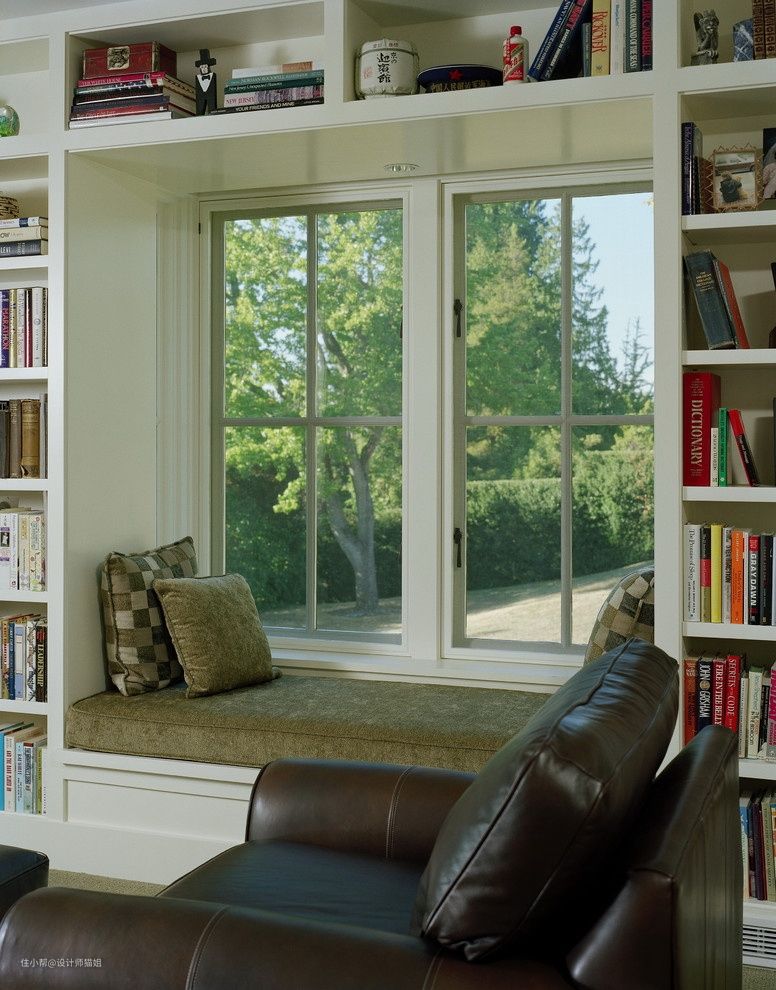① 可以把家里的飘窗用起来,打造成阅读区域。以窗户为中心打造,可以把飘窗做延伸,放上垫子,窗户的周围做成格子放书。中间的飘窗可以坐在上面阅读,会很舒适。
