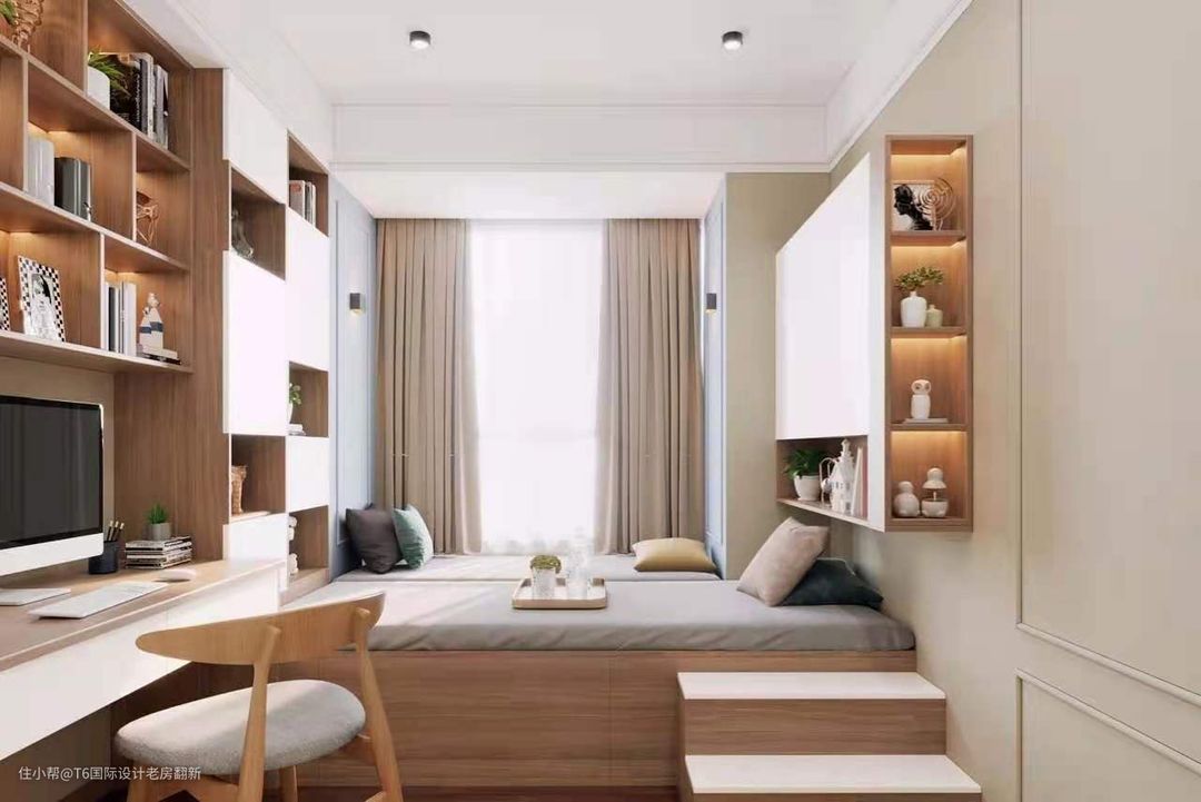 飘窗大致分为两种类型,外飘窗和内飘窗,有的适合做榻榻米/书桌/书柜布置,有的不适合。需要根据不同的飘窗类型,来做出不同的布置。