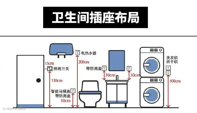 1、智能马桶盖:带防溅水盖的五孔插座(1个)、靠近马桶一侧,远离淋浴区、距离地面50cm