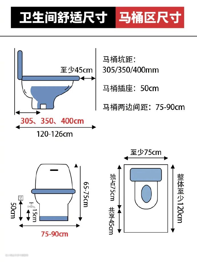 马桶的尺寸大小一般在40cm*75cm*75cm左右,这个宽度、长度和高度都相对适中,这样的马桶比较符合我们普通人的身体构造。而马桶的墙壁和洗手台之间,最好能距离20cm左右,这样抬起手肘或者拿东西的时候才不会感觉到拥挤憋闷。马桶和过道墙壁或者其他洁具之间的距离最好在45cm以上,这样的马桶用起来会比较舒适。马桶坑距的标准是305mm,350mm和400mm,马桶进水口距离地面15cm。