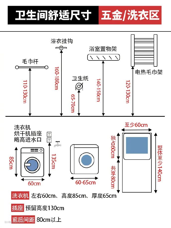 不管是洗衣机还是烘干机,标准尺寸一般都在60cm~65cm,所以以宽在60cm,高85cm的洗衣机为例,洗衣机插座要高于洗衣机的进水口,一般在135cm为佳。洗衣机整体区域在140cm,人员活动不得少于80cm。洗衣机插座安装在边上,高度要高于出水口。