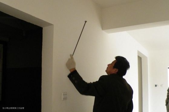 ●然后是空鼓检测,使用专用的小锤垫着纸敲打墙面,如果发出的声音不实,后期可能需要用腻子进行填平处理。