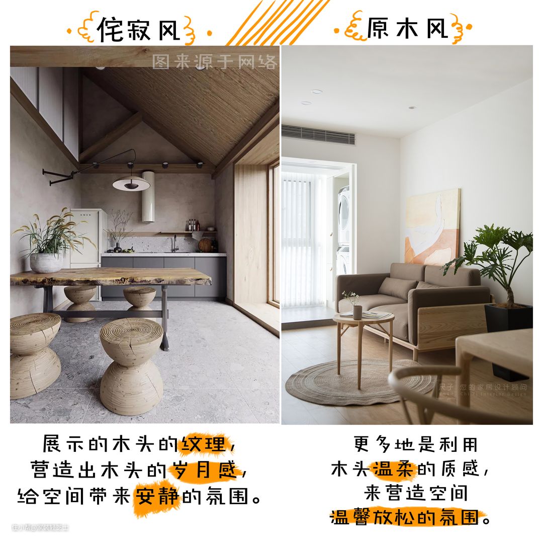 那是因为这套侘寂风里,木质元素用的很多。他们之间最大的区别是木头质感营造出的氛围不同。