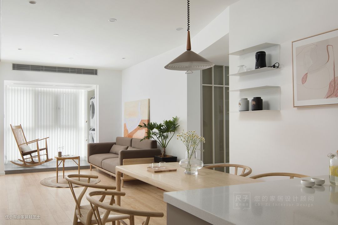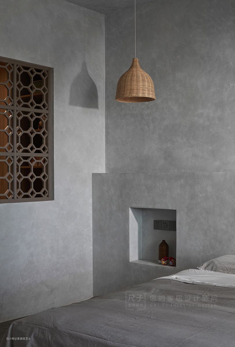 材质:侘寂风的硬装一般是以简洁为主,整个空间所用到的材质是哑光、原生态质朴的感觉。