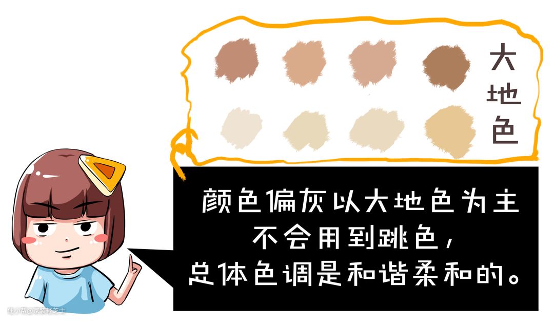 其他颜色以大地色为主,少用到跳色,大多数是灰色系或米色系。色调要和谐柔和。