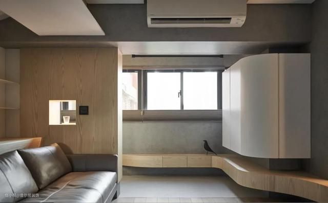 考虑到户型较小,为了减少层高上的压抑感,所以设计师没有做中央空调,而是选择了小尺寸大匹数的挂机,悬挂在承重量上方,简洁美观,同时也不会像柜机那样占用地面空间