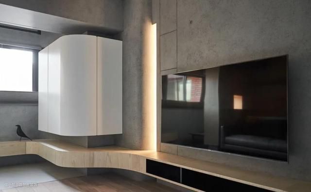 客厅内线条简洁硬朗,局部穿插弧形线条,视觉感更加柔软轻盈。阳台与客厅,通过曲面收纳柜和弧形台面完美衔接,将边边角角的面积都合理的利用上了,提高整屋收纳空间