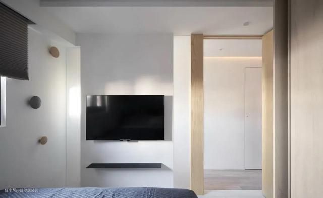 床的侧面是嵌入式衣柜,嵌入式移门衣柜,并结合移门的设计,更节省使用空间。床尾处安装了电视,躺在床上就能追剧,太幸福了吧!