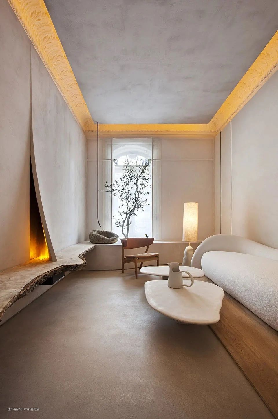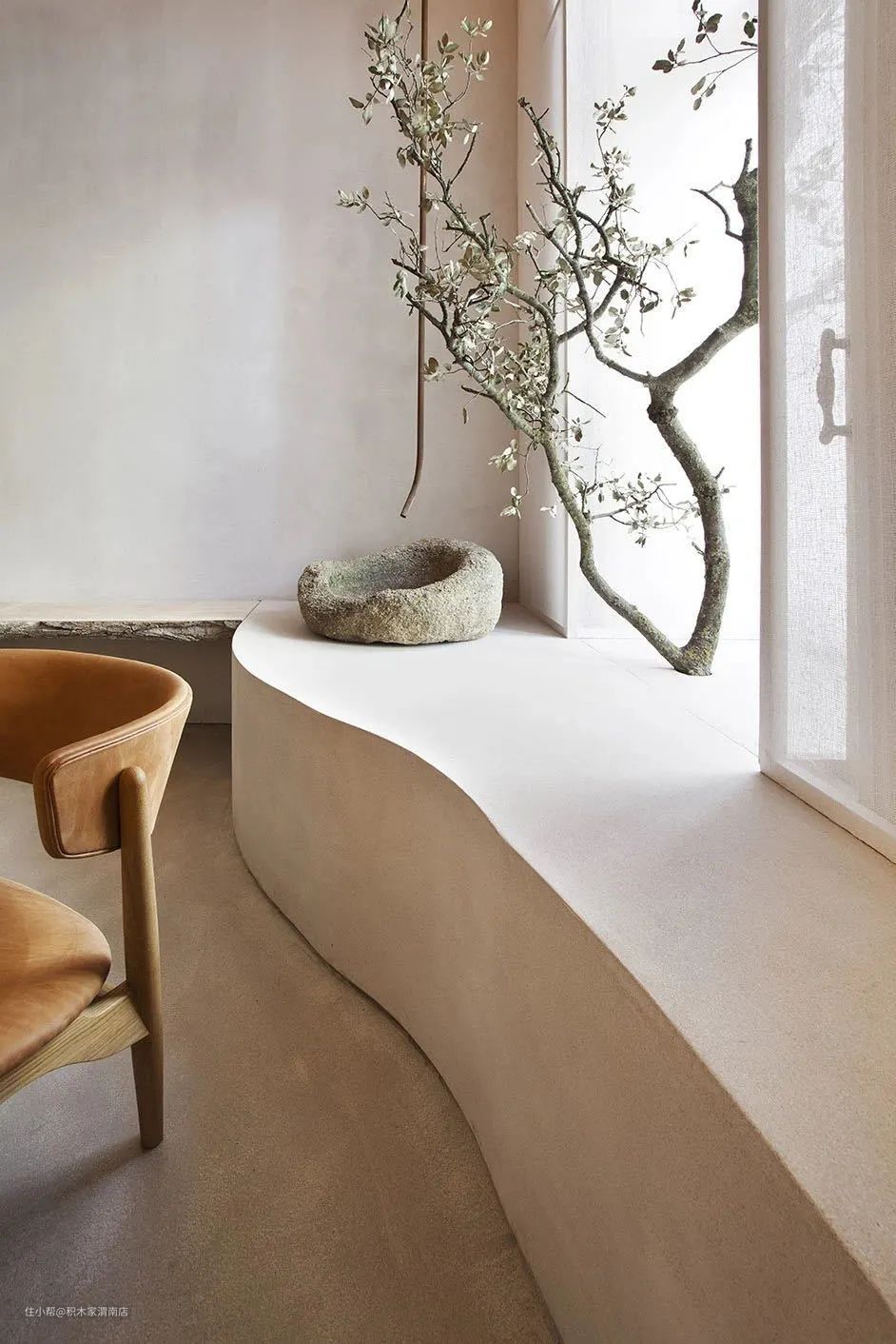 侘寂风的设计中弱化了空间中的线面穿插感,为了使空间视觉上更加柔和纯粹,曲线和曲面的运用非常广泛,将各种角度的曲面重组叠加,呈现出优雅的弧度,就是侘寂设计在结构中所需要注意的地方。