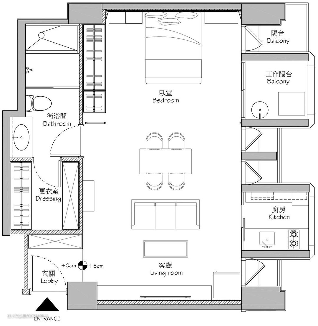 原户型的格局是一室一厅,隔墙较多,造成室内采光不佳。设计师与屋主进行多次“思想碰撞”后,对户型做出了如下调整: