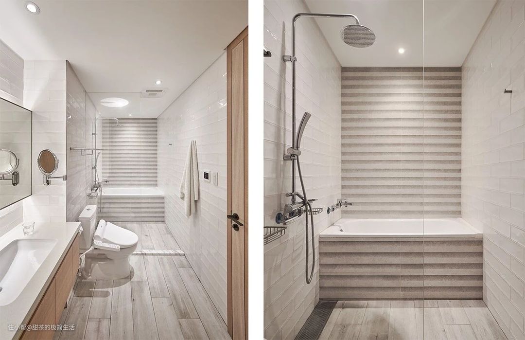卫生间与卧室相邻,面积比较小,但内部功能非常丰富,浴室柜、马桶、淋浴和浴缸一应俱全。